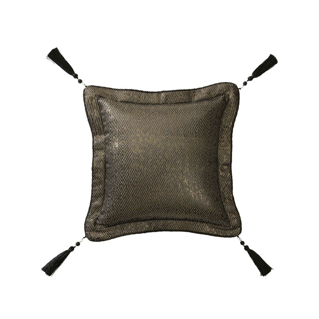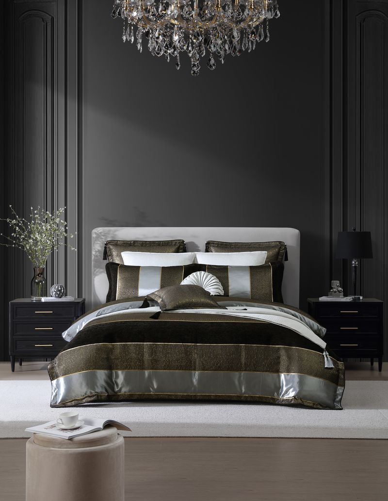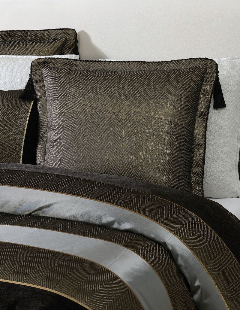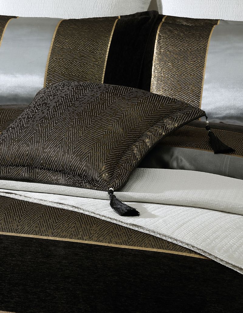 The Sovereign quilt cover makes a striking statement with its bold, large-scale stripes in elegant gold, silver, and black. Textural chenille and lurex yarns add depth, while the chevron texture serves as a captivating focal point. Finished with twisted black cord and tassels, this luxurious design exudes sophistication and modern flair.