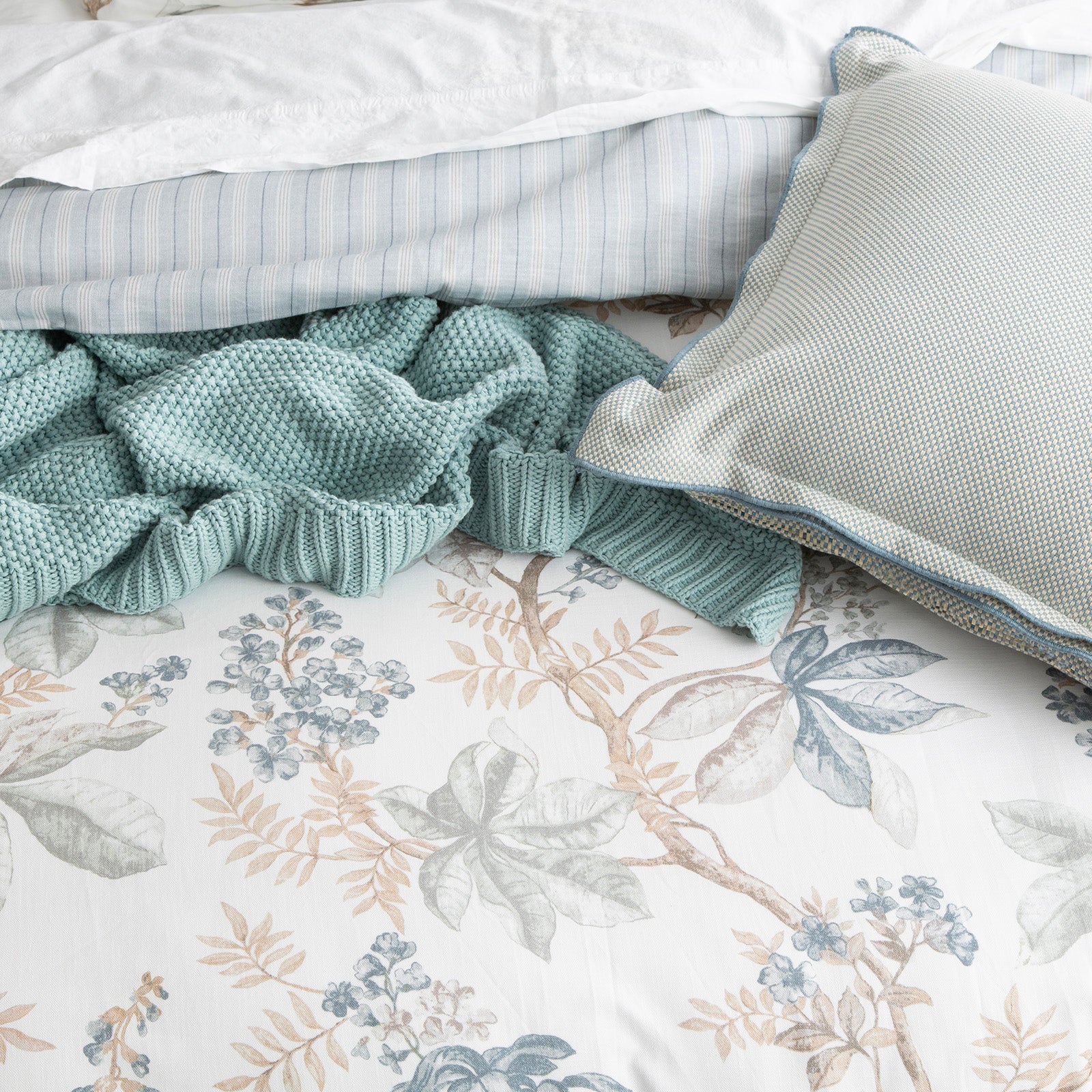 Designed to capture the charm of blooming gardens, this set features a crisp white base adorned with delicate blue flowers & trailing vines, creating an elegant timeless statement. The reverse side showcases a soft blue stripe pattern, offering a versatile styling option for a lighter, more contemporary feel. Premium cotton slub, it delivers natural texture, breathability. Thoughtfully detailed with button fastenings & flat piping, this set blends artistry with practicality—ideal for those who love a classic floral look with a modern twist. OEKO-TEX® STANDARD certified, it’s gentle on your skin and kind to the planet. Adding on European pillowcase, makes this whole setting more desirable.