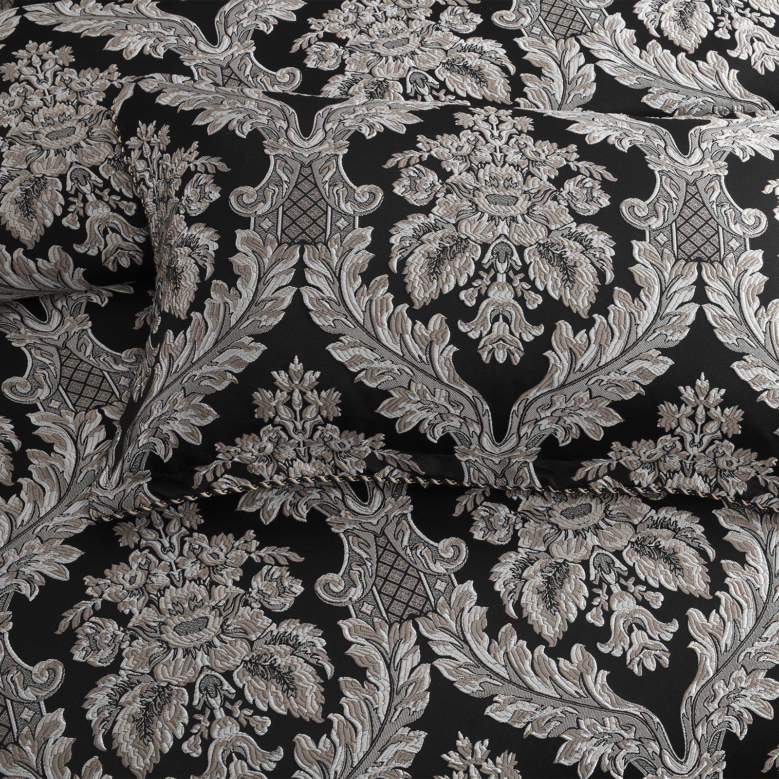Elevate your bedroom décor with the Greta Quilt Cover Set from the Regalia Collection — a true symbol of sophistication and luxury. Crafted from a beautifully woven jacquard damask, this design features an exquisite blend of soft champagne and deep black hues that radiate timeless glamour. The intricate detailing and rich texture add depth and visual appeal, while metallic guipure lace inserts provide a touch of refined elegance. Perfectly balanced between opulence and modern style, the Greta Quilt Cover Set transforms your space into a serene and graceful retreat. Pair it with matching European pillowcases and a coordinating square cushion to complete the look of understated luxury. OEKO-TEX® STANDARD certification, this design perfectly blends comfort, craftsmanship, & timeless appeal. Add On Bed cushion & European Cushions makes them luxuriously seductive.