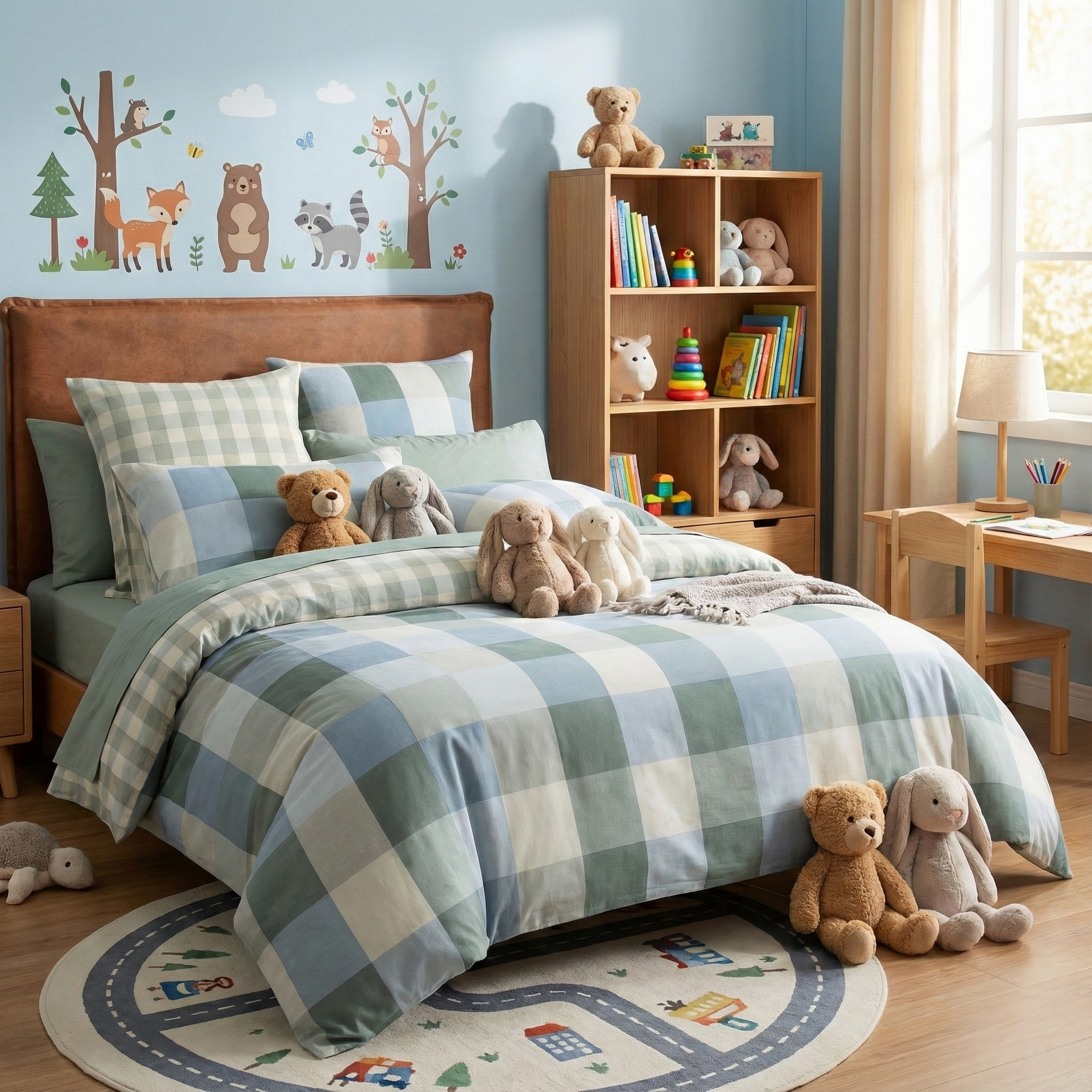 Add warmth & dimension to your bedroom with the Jackson Check Quilt Cover Set. This in-house design is made from textured cotton slub, engineered using thicker yarns for a beautifully soft tactile finish. The front showcases oversized checks in rich green, blue, off-white tones, while the reverse reveals a delicate check pattern, extending the design story for a cohesive and balanced room setting. With its matte texture, enclosed button detail & OEKO-TEX® STANDARD certification, this design perfectly blends comfort, craftsmanship, and timeless appeal. Adding on European pillowcase, makes this whole setting more desirable.