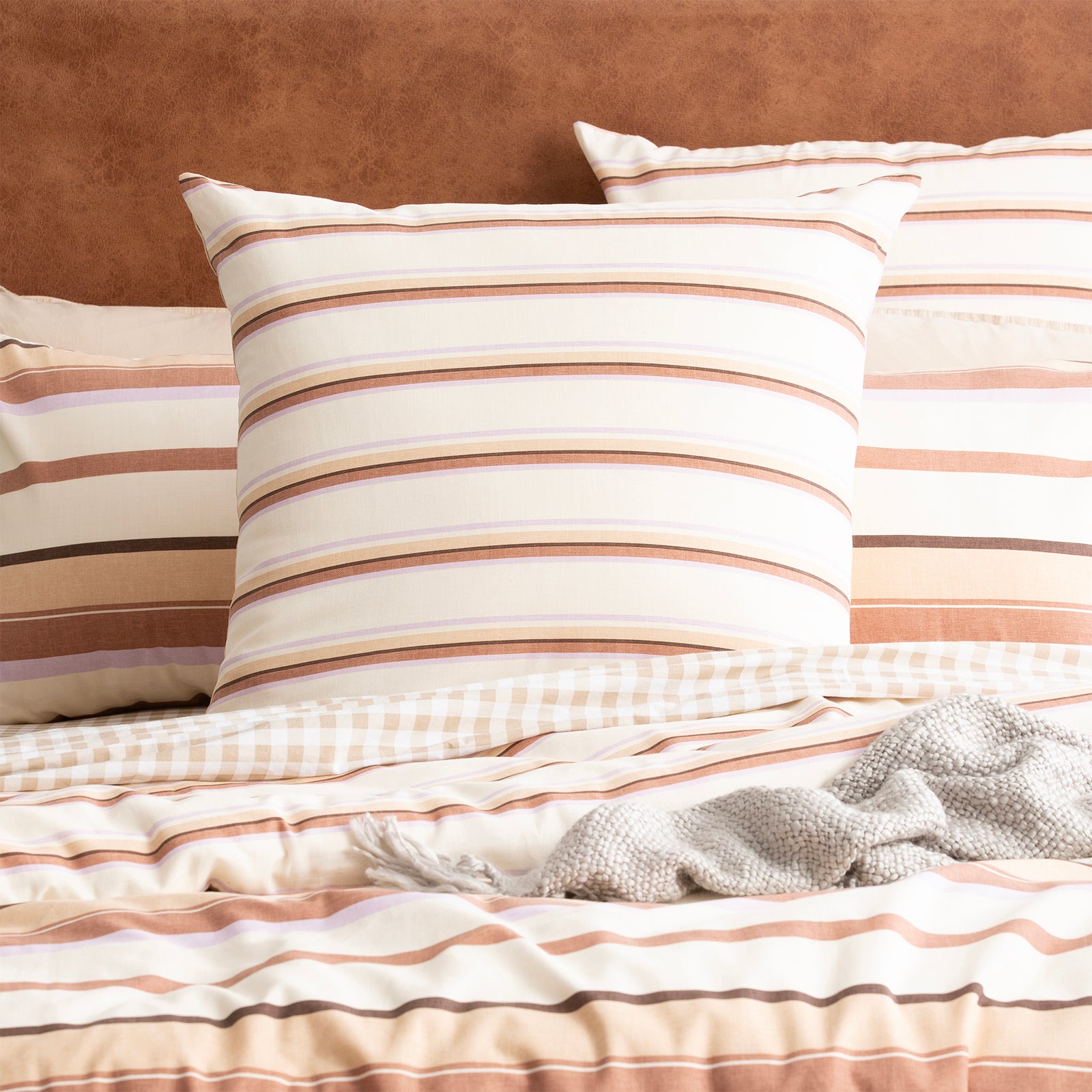 The Williams Stripe Quilt Cover Set brings a modern coastal charm to your bedroom with its soothing palette & elegant stripe design. Crafted from premium cotton, this set offers a soft & breathable feel, ensuring year-round comfort. The harmonious combination of caramel, Beige, Lilac & Clay stripes create a calm & inviting atmosphere, while the subtle reverse pattern adds a touch of versatility to your styling options. Whether paired with neutral tones or layered with textured throws & cushions. Fully OEKO-TEX® STANDARD certified, it’s gentle on your skin and kind to the planet. Adding on European pillowcase, makes this whole setting more desirable.