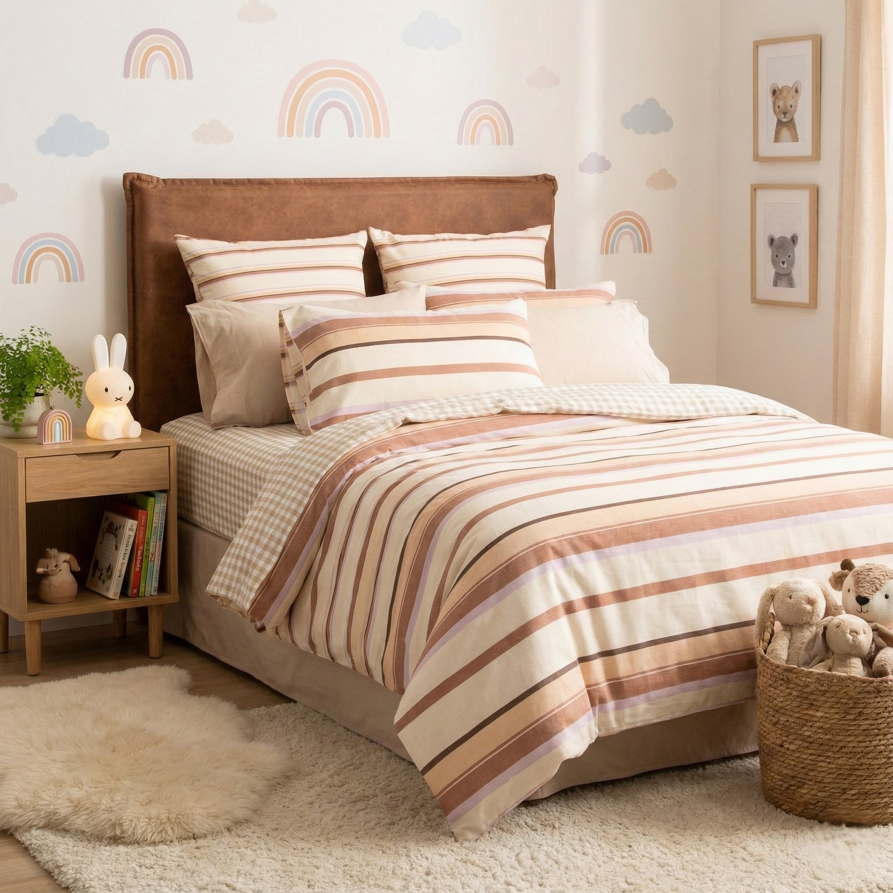 The Williams Stripe Quilt Cover Set brings a modern coastal charm to your bedroom with its soothing palette & elegant stripe design. Crafted from premium cotton, this set offers a soft & breathable feel, ensuring year-round comfort. The harmonious combination of caramel, Beige, Lilac & Clay stripes create a calm & inviting atmosphere, while the subtle reverse pattern adds a touch of versatility to your styling options. Whether paired with neutral tones or layered with textured throws & cushions. Fully OEKO-TEX® STANDARD certified, it’s gentle on your skin and kind to the planet. Adding on European pillowcase, makes this whole setting more desirable.